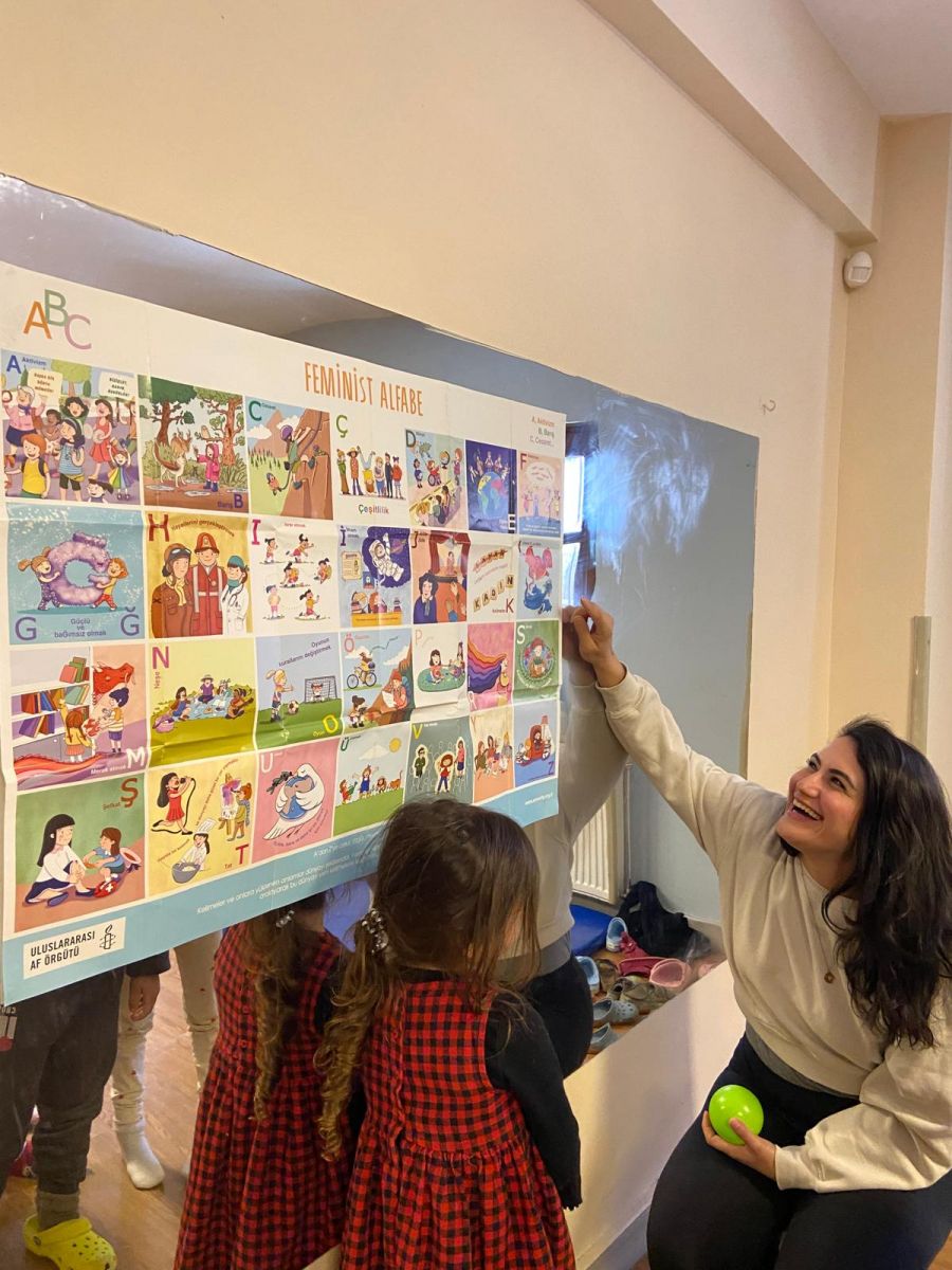 BBOM Koşan Kaplumbağa Anaokulu’nda 3–5 yaş aralığındaki 35 çocukla toplumsal cinsiyet temalı bir yaratıcı drama atölyesi düzenlemiştir. Çocuklara, kendi haklarını dramatik oyunlarla keşfetmeleri için; kapsayıcı ve eşitlikçi bir yaklaşımla çeşitli oyunlar hazırlanmış ve bu oyunlara Uluslararası Af Örgütü’nün Feminist Alfabesi eşlik etmiştir. Çocuklar, Feminist Alfabe’deki harflerle kendi algı bütünlüklerine ve ihtiyaçlarına göre kelimeler ve sorular üretmiş; haklarına bir kelimeler bütünü üzerinden bakabilmişlerdir.